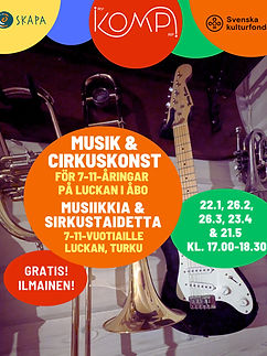 Musik- och cirkusverksamhet för 7-11-åringar på Luckan i Åbo under våren 2026.
